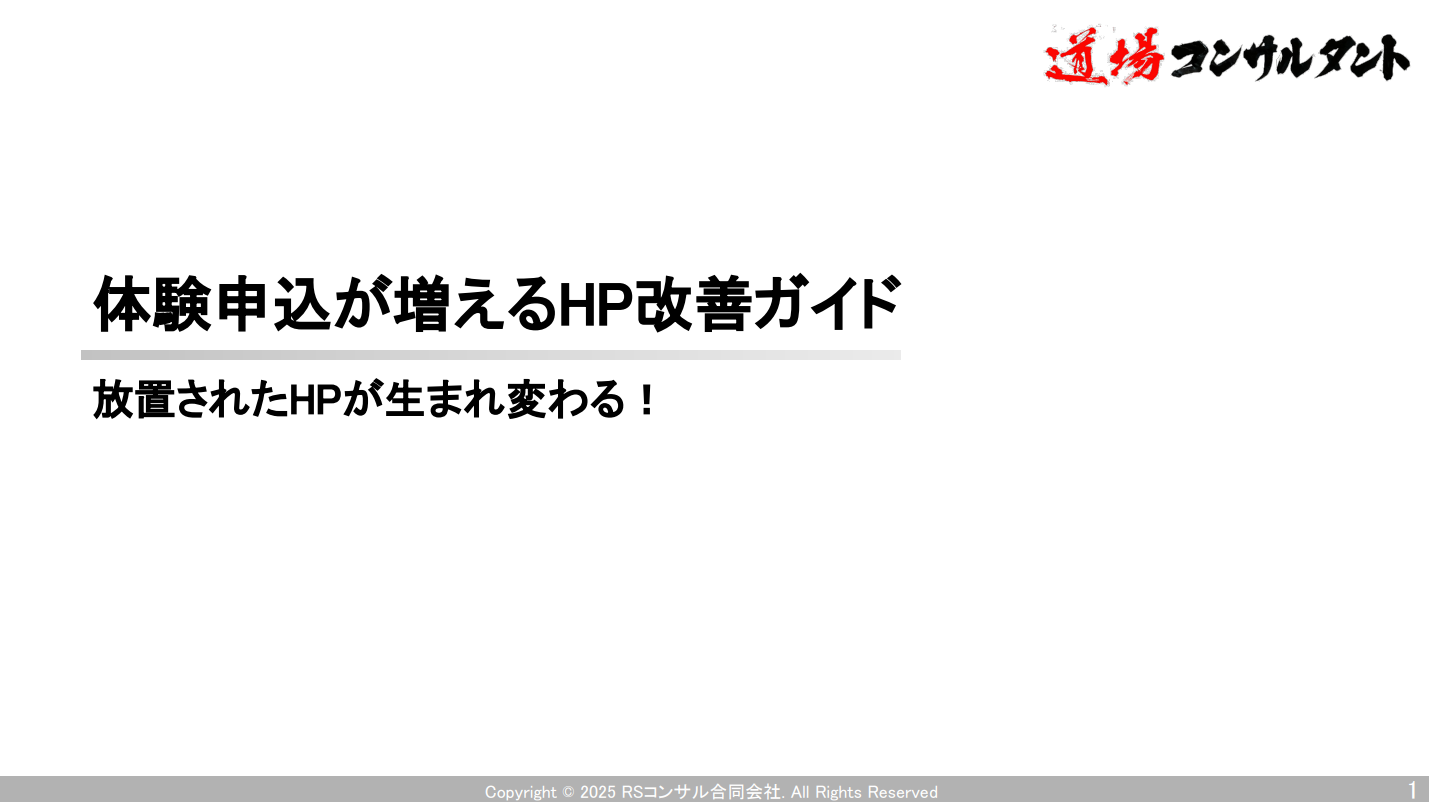体験申込が増えるHP改善ガイドダウンロード 無料チェックリスト 道場経営やホームページの改善点を、たった1分でチェック!今すぐ使える無料チェックリストを配布しています。 LINEで友だち追加するだけ!今すぐチェックする LINEで友だち追加するだけ!今すぐチェックする でコラムを受け取る